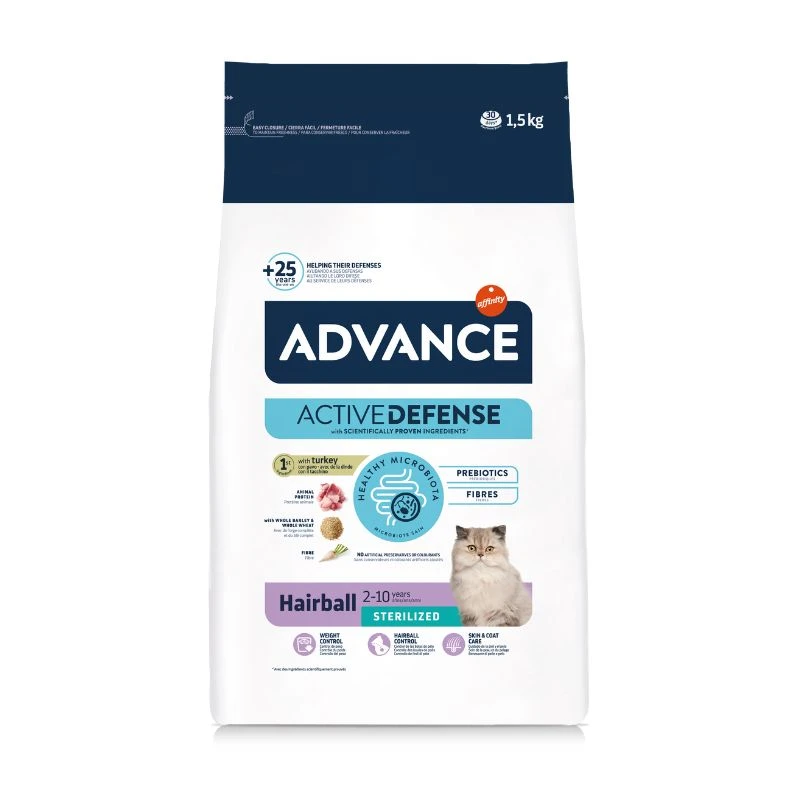 Advance Sterilized Adult Hairball מזון יבש ומלא לחתולים בוגרים מסורסים/מעוקרות הסובלים מהיווצרות כדורי שיער. פותח במיוחד כדי לסייע בשליטה על כדורי השיער. הודות לתכולת הסיבים הגבוהה המזון מקל על סילוק הפרווה, ומסייע בהפחתת היווצרות כדורי שיער. מסייע בשמירה על משקל הודות לתכולת שומן וקלוריות מתונה, ובשמירה על רמת ה-pH בשתן הודות לתכולת המינרלים המאוזנת. תורם לטיפוח העור והפרווה, הודות לחומצות השומן אומגה 3 ואומגה 6, ולאבץ. גודל הכופתיות מותאם לפה של חתול בוגר.