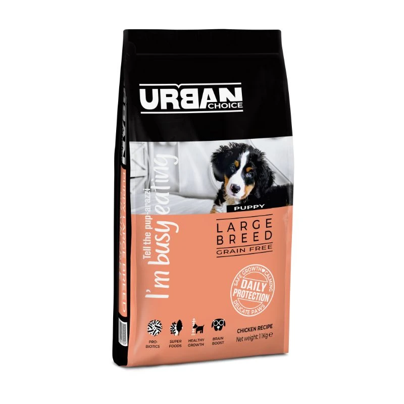 URBAN CHOICE PUPPY LARGE BREED – מזון יבש, מלא, עשיר ומאוזן לגורי כלביםאורבניים מגזע גדול על בסיס עוף.בטבע הם ציידים, אבל כלבי העיר צדים לרוב בין המיטה לספה. למרות זאת, הם עדיין חשופים לנזקי העיר: רעש המוביל לסטרס,זיהומים אשר פוגעים בבריאות ומראה העור והפרווה, משקל עודף… URBAN CHOICE מותאם לאורח החיים האורבני ומבין את הצרכים של חיית המחמד שלך בקצב החייםהמסחרר של העיר הגדולה. נוסחת ה- Daily Protection מכילה את שלושת עקרונותהיסוד לתזונה אורבנית בריאה עבור הכלב שלכם.• SAFE GROWTH: מכיל חומצת שומן מסוג DHA ו-EPA החיוניות לגדילה והתפתחות תקינה של המח.• CALMING: מכיל רכיבים ייחודיים כגון קמומיל, פסיפלורה, וחיידקים פרו-ביוטיים לשמירה על תחושת הרוגע.• DELICATE PAWS: מסייע בשמירה על כפות הרגליים מפני שחיקה באמצעות שילוב ייחודי של 150 מ"ג/ק"ג אבץ