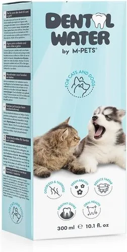 אמפט מי פה לכלבים ולחתולים, M-PETSDental Water for Dogs & Cats. מי פה לכלבים ולחתולים. לשמירה על הגיינת הפה ולריענון הנשימה. מסייעים להפחתת הצטברות אבנית ולמניעת בעיות שיניים, למניעת ריח רע מהפה ולתמיכה בבריאות החניכיים. להוספה למי השתייה של הכלב או החתול. ללא טעם וריח להבטחת חווית שתיית מים נעימה של הכלב או החתול. תכולת אריזה: 300 מ"ל.