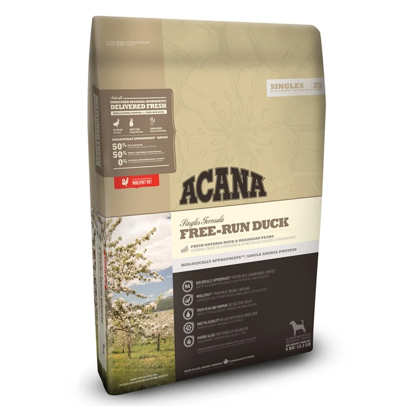המזון היבש של ACANA מותאם ביולוגית להתפתחות האבולוציונית של כלבים ולאנטומיה של מערכת העיכול שלהם.המזון של אקאנה מיוצר מהרכיבים הטובים בעולם במטבחים אמיתיים ומהמתקדמים בענף כדי לשמור על הערכים התזונתיים של המזון ולספק לכלב שלכם את מה שהטבע יעד לו. אקאנה SINGLES הינה סידרת מזונות מותאמים ביולוגית המכילים רכיבים ממקור חלבון יחיד ומותאמת במיוחד עבוד כלבים רגישים, בכל שלב של חייהם.
