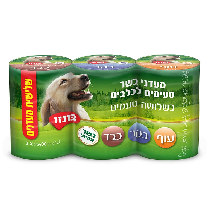 מעדן בונזו באריזת מולטיפק הכוללת 3 מעדנים: מעדן עוף, מעדן כבד ומעדן בקר. כל מעדן מגיע בקופסאות שימורים במשקל 400 גרם, עם פתח-קל.מכיל בשר אמיתי! ללא חומרים משמרים במרקם פטה עדין, רך וטעים מאוד. מוכן להגשה בכל זמן כתוספת מפנקת, כפרס או כגיוון למזון היבש.