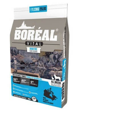 Boreal Vital Dog – Whitefish, 11.33kg מזון יבש מלא לכלבים בוגרים. מתאים לכל הגזעים. 60% חלבון מין החי, 40% חלבון מין הירקות ופירות. ללא דגן, גלוטן או תפו"א. תוצרת: קנדה