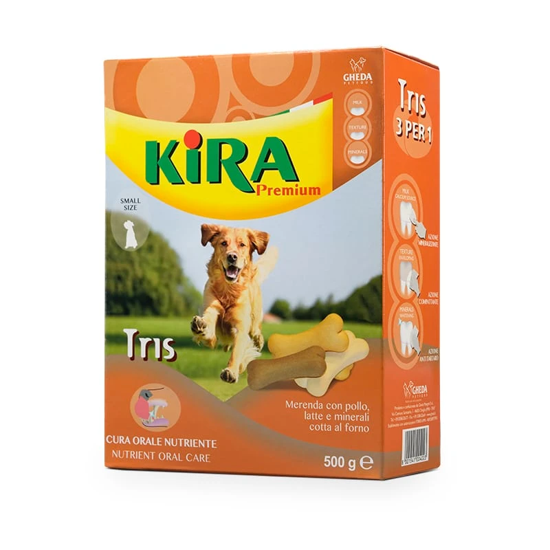 Kira- ביסקוויט דנטלי- רול בטעם עוף מזון יבש משלים לכלב. מועשר בויטמיניםA, E , D3 ובמינרלים המחזקים את בריאות השן. מסייע במניעת היווצרות פלק וטרטר בשיני הכלב, יעיל במיוחד במניעת דלקות חניכיים.מומלץ לתת כפרס או חטיף בין הארוחות.