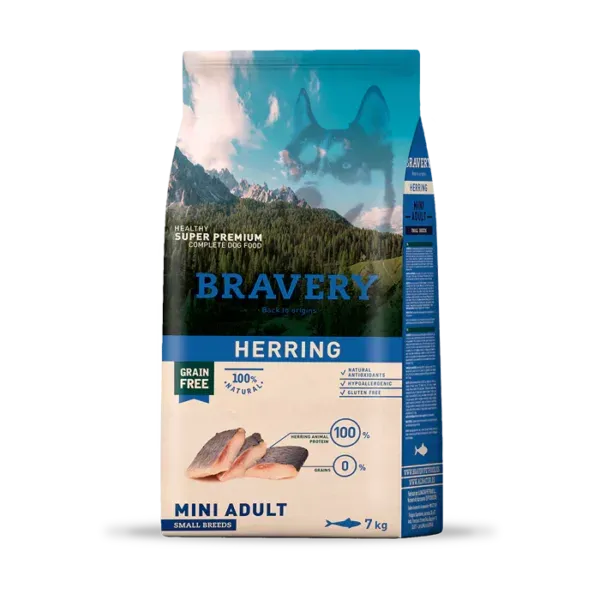 BRAVERY ברייברי הרינג מיני לבוגרים (גזעים קטנים) הוא מזון יבש רק עם מרכיבים טבעיים ואיכותיים, שיבטיח תזונה מושלמת ובריאה לכלב הקטן שלך החל מגיל שנה.