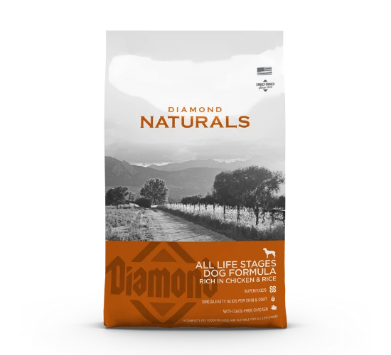 דיימונד נאטורלס לכלבים בכל שלבי החיים, עשיר בעוף ואורז הוא מזון מאוזן ומלא המתאים לכלבים בכל הגילים.עשיר בעוף כמקור לחלבונים ושומן, המהווים אבני בניין לבניית שרירים ומספקים אנרגיה. מועשר במזונות על, שהם מקור לכמות אופטימלית של ויטמינים, מינראלים ונוגדי חמצון – התורמים למערכת חיסון חזקה ובריאה. עשיר בסיבים פרה- ביוטיים התורמים למערכת העיכול.