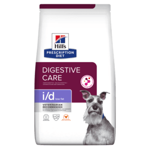 מזון דיאטטי מלא מופחת שומן לתמיכה במערכת העיכול בכלבים הסובלים מהפרעות עיכול.