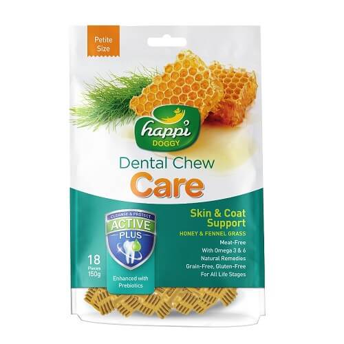 Honey|Fennel Grass Happi Doggi Dental Chew הפי דוג דבש ושמור דנטלי הינו חטיף דנטלי לכלבים, המתאים לכל הגזעים וכל הגילאים. החטיף בטעם דבש ושומר, נטול בשר, ללא דגנים וללא גלוטן. מכיל אומגה 3 ו-6. חטיף דנטלי טבעוני, אנטי בקטריאלי המיועד לניקוי שיניים והגנה מפני דלקות.