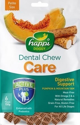 Pumkin|Mountain YAM Happi Doggi Dental Chew הפי דוג דלעת ושומר דנטלי הינו חטיף דנטלי לכלבים, המתאים לכל הגזעים וכל הגילאים. החטיף בטעם דלעת ושומר, נטול בשר, ללא גנים וללא גלוטן. מכיל אומגה 3 ו-6. חטיף דנטלי טבעוני, אנטי בקטריאלי המיועד לניקוי שיניים והגנה מפני דלקות.