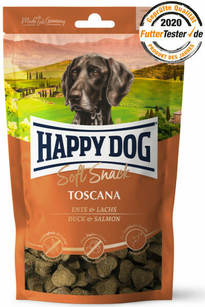 Happy Dog Soft Snack Toscana With Duck and Salmon 100g הפי טוסקנה הינו חטיף טעים ומזין במיוחד המתאים לכלבים מכל הגזעים. חטיף עשוי מבשר ברווז וסלמון כמקור חלבון מין החי, בתוספת צמחי מרפא ים תיכוניים, ללא תוספת סוכר, וללא חומרים משמרים. פורמולה ללא חיטה עם 6.5% שומן בלבד, אידיאלית במיוחד לכלבים הנוטים לעודף משקל, כלבים מסורסים וכלבים תובעניים מגזעים בינוניים וגדולים. האריזה עם סגירה לשמירה על טריות לאורך זמן. תוצרת: גרמניה