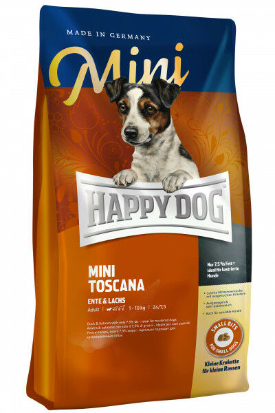 Happy Dog Mini Toscana 4kg מזון יבש מלא לכלב בוגר מגזע קטן עד משקל 10 ק"ג בבגרות, עם כופתיות קטנות. מכיל רק 7.5% שומן, אידיאלי גם לכלבים מסורסים. מטבח ים תיכוני דל קלוריות ועם עשבי תיבול. מאוזן ובעל נעכלות גבוהה. מתכון נטול גלוטן. מותאם ומומלץ לכלבים בעלי רגישויות. עם צדפת ניו-זילנד למפרקים בריאים. 24% חלבון, 7.5% שומן. 72.5% חלבון מן החי. תוצרת: גרמניה