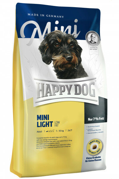 Happy Dog Mini Light 4kg מזון יבש מלא לכלב בוגר מגזע קטן עד משקל 10 ק"ג בבגרותו, ברמת פעילות נמוכה. 66.9% חלבון מן החי. תוצרת: גרמניה