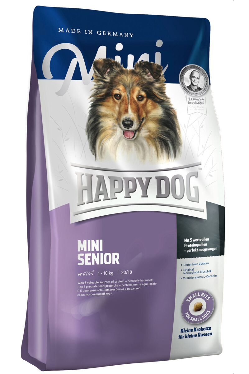 Happy Dog Mini Senior 4kg מזון יבש מלא לכלב מבוגר מגזע קטן – עד משקל 10 ק"ג בבגרות, עם אנרגית L-קרטנין. מזון מאוזן עם 5 מקורות חלבון(עוף, סלמון, דגים, טלה, ביצים). מתכון נטול גלוטן. מועשר בסובין לנעכלות טובה יותר, ויטמין C וצדפת ניו זילנד המקורית ו- L קרניטין. 23% חלבון ו- 10% שומן תוצרת: גרמניה