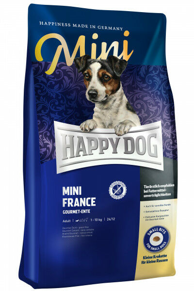 Happy Dog Mini France 4kg מזון יבש מלא לכלב בוגר מגזע קטן, עם ברווז ותפו"א. מתכון ללא גלוטן. מכיל חלבון יחיד מן החי,25% ברווז. 24% חלבון ו- 12% שומן. מומלץ ע"י וטרינרים. תוצרת: גרמניה