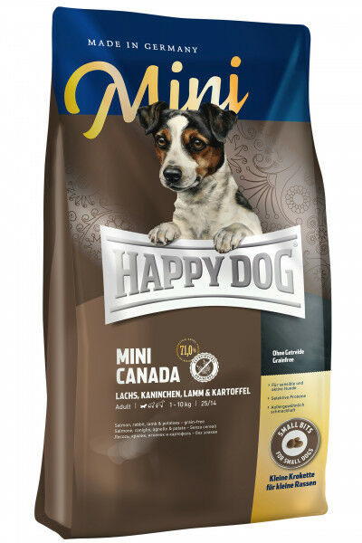 Happy Dog Mini Canada 4kg מזון יבש מלא לכלב בוגר מגזע קטן עד משקל 10 ק"ג בבגרות. מתכון נטול גלוטן, מאוזן עם 5 מקורות חלבון (עוף, סלמון, דגים, טלה, ביצים) ועשיר באנרגיה (25% חלבון/ 14% שומן). מכיל צדפת ניו-זילנד למפרקים בריאים, גלוקוזמין וכהודרנטין לתמיכה בסחוסים ועצמות, וחמוציות לתמיכה במערכת השתן. תוצרת: גרמניה