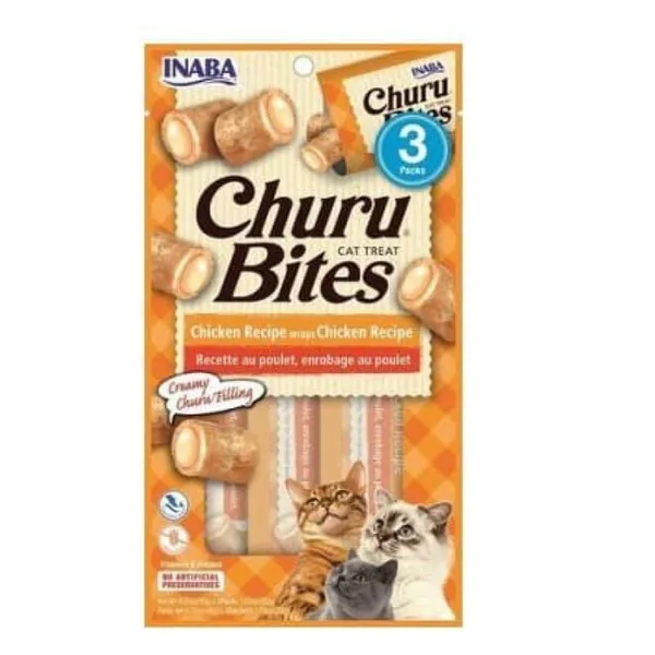 חטיף אינאבה צ`ורו בייטס עוף לחתולחטיפי בייטס, מזון רך ומשלים לחתולים בצורת כריות במילויי קרמי בשלל טעמים. מגיע במשקל 30 גרם (3X10).