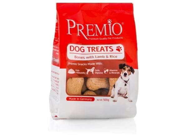 חטיף ביסקוויט פרמיו טעים ובריא לכלב עם כבש ואורז. מתאים כתוספת מפנקת לכל יומו של הכלב.
