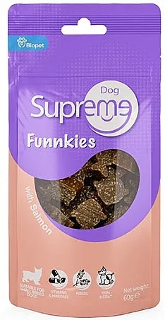 חטיף לכלב מגזע קטן סופרים דגים 60 גרםחטיף דגיגונים רך ומשלים בטעם סלמון ועשבי תבלין המתאים לכלבים מגזע קטן. ללא עוף.FUNNKIES – סדרת החטיפים הכי FUN שיש! מגוון חטיפים בצורת, טעמים וגדלים שונים כך שכל כלב יוכל למצוא מה ללעוס. החטיפים מועשרים בוויטמינים ומינרלים, סיבים תזונתיים ותורמים לבריאות העור והפרווה. תוצרת אירופה. מומלץ לתת בין הארוחות או כפרס. יש לדאוג למי שתייה זמינים וטריים לצד המזון בכל עת. הוראות אחסון: יש לאחסן את המזון באריזה סגורה במקום קריר ויבש.רכיבים: עמילן אפונה, חלבוני סלמון מיובשים (14%), אפונה (12%), גליצרין, הדרוליזט חלבון מן החי, ויטמינים, סיבי ירקות, צמחי תבלין מיובשים (0.03%), אנטיאוקסידנטים.סימון תזונתי: חלבון גולמי 19%, שמנים ושומנים גולמיים 2.2%, אפר גולמי 7%, סיבים גולמיים 2.6%, לחות 20%.תוספים תזונתיים: ויטמינים: ויטמין D3 200 IU, ויטמין E 15 מ"ג, ביוטין 100 μg.