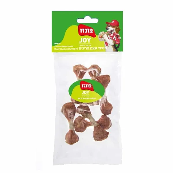 חטיפי עצם פריכיםמזון משלים יבש לכלבים. • חטיף בונזו ג'וי מבשר אמיתי מספק לכלבכם נשנוש זמין, טבעי ובריא, עתיר חלבון ודל שומן! • חטיפי בונזו ג'וי אינם מכילים תוספים, חומרים משמרים או צבעי מאכל. • לחטיפי בונזו ג'וי טעם וריח משגעים שכלבים מאוד אוהבים.