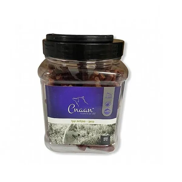כנען מקלות עוף 400 גרםחטיף רך מקלות עוף ללעיסה בצנצנת פלסטיק לשמירה על הטריות, חטיף מבשר איכותי ללא אנטיביוטיקה, עשוי מבשר אמיתירכיבים: עוף (40%), אורז וקמח חיטה (58%), גליצרין (2%)