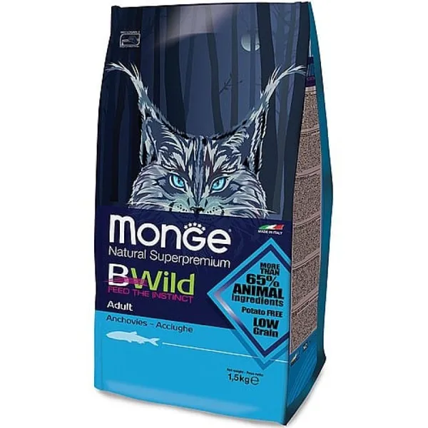 מונג ביוויילד אנשובי לחתולמונג ביוויילד אנשובי לחתול MONGEרכיבים מונג' חתול Bwild אנשובי:אנשובי (טרי 15%, מיובש 35%), אפונה צהובה, עמילן טפיוקה, שומן מן החי (שמן עוף המכיל 99.5% חומרים משמרים טבעיים), אורז,שיבולת שועל, ציפת סלק, חלבון מיובש מן החי, שמרים מותססים (מקור לMOS וB12), אבקת ביצים (1%, עשיר בחלבונים שלמים), זרעי פשתן (1%),גזרים מיובשים, עגבניות מיובשות (1%), סיבי אפונה לא מסיסים, טאורין, XOS (xylo-ligosaccharides 3 גרם / ק"ג), יוקה schidigera, גזע אננס,אוכמניות מיובשות, חמוציות מיובשות, פטל מיובש.תכולה תזונתית מונג' חתול Bwild אנשובי:חלבון 34% ,שומן 17% ,תאית 2.5% ,סיביים גולמיים 2.5% ,אפר 7% ,סידן 1.20% ,זרחן 1.1% ,מגנזיום 0.8%, נתרן 0.2%,אומגה 6 8% ,אומגה 3 0.95%. קישור לאתר : לחץ כאן