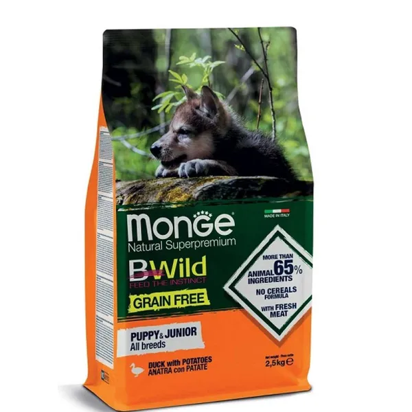 Monge Natural SuperPremium Grain Free Formula All Breeds Puppy & Junior Duck With Potatoesהוא מזון לחיות מחמד מלא ומאוזן לגורים. נוסחה לרווחתם של הגורים מכל הגזעים שלך הודות לבחירה של מקורות אלטרנטיביים של פחמימות שאינן נגזרות מדגנים, כמו תפוחי אדמה. המתכון מועשר ב-MOS (מנאן-אוליגו-סכריד) וב-XOS (קסילו-אוליגוסכריד), קומפלקס של פרה-ביוטיקה, השומרים על בריאות המעיים. הפורמולה תומכת במפרקים באמצעות הכללת גלוקוזאמין וכונדרואיטין סולפט. חומצות השומן אומגה 3 לתמיכה בעור ובפרווה, ומעניקות ברק לשיער. הוא מכיל ספירולין ו-yucca schidigera, לשליטה בארומה של המעיים. מתאים לגורים מכל הגזעים.רכיבים: בשר ברווז (מיובש 38% וטרי 15%), תפוחי אדמה (13%), שומן מן החי (13%) (שמן ברווז מטוהר ב-99.5%), חלבון תפוחי אדמה (10%), שמרי בירה, עיסת סלק מיובשת, שמן דגים (שמן סלמון מטוהר ב-99.5%), חלבונים מהחי שעברו הידרוליזה, מינרלים, מנאן-אוליגו-סכריד (MOS 1%), Xylo-oligosaccharide (XOS 0.3%), יוקה schidigera (0.3%), ספירולין (0.3%), גלוקוזאמין ( 0,057%), כונדרויטין סולפט (0,04%), אבקת חלבון חלב.חלבון גולמי 29%, סיבים גולמיים 2%, שומן גולמי 18%, אפר גולמי 7.5%, סידן 1.5%, זרחן 1%, חומצות שומן n-3: 0.7%, חומצות שומן n-6: 3.0%.קישור לאתר יצרן: לחץ כאן