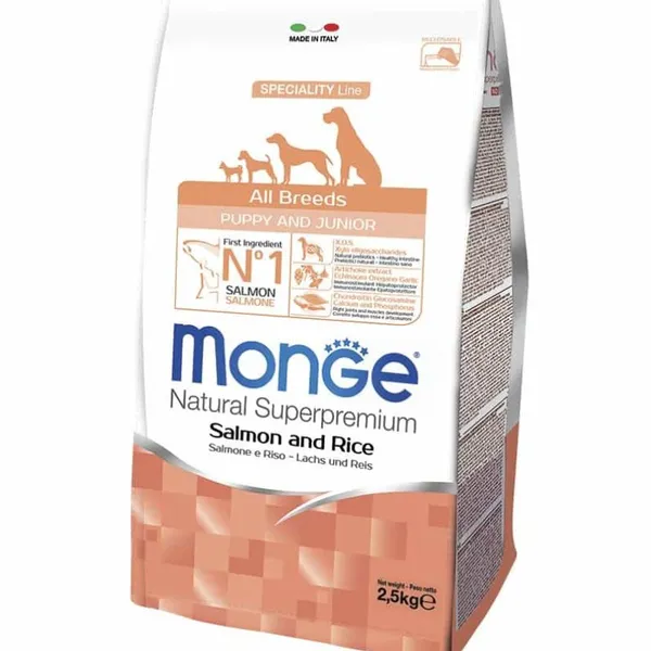 מזון טבעי סופר פרימיום יבש מלא של מונג׳ לגורים ולכלבים צעירים מכל הגזעים – סלמון ואורזרכיבים: דגים (סלמון טרי 10% , מיובש 26% ), אורז, תמצית חלבון תפו״א, תירס, עיסת סלק, גלוטן תירס, שמרי בירה (מקור ל- MOS וויטמין B12 ), חלבון מן החי שעבר הידרוליזה, שומן מן החי ( 99.5% שומן עוף מיוצב בסיוע נוגדי חימצון טבעיים), שיבולת שועל (מקור לסיבים אצילים), XOS (קסילו אוליגו סכרידים 3 ג/ק״ג), שמרים שעברו הידרוליזה ( MOS ), סחוס ממקור מימי (מקור לכונדרטין גופרתני), סרטנים (מקור לגלוקוזמין), מתילסולפנו מתאין, יוקה, ספירולינה, שורש אכיניצאה, אורגנו, אבקת שום מיובשתכולה תזונתית של ויטמינים ומינרלים: ויטמין 26,000 A יב"ל/ק"ג, ויטמין 1800 D3 יב"ל/ק"ג, ויטמין 200 E מ"ג, ויטמין 22 B1 מ"ג , ויטמין 25 B2 מ"ג, ויטמין 12 B6 מ"ג, ויטמין 230 B12 מ"ג, ביוטין 30 מ״ג, ניאצין 80 מ״ג, ויטמין 130 C מ״ג, חומצה פנטטונית 30 מ״ג, חומצה פולית 2.9 מ״ג, כולין כלורידי 3,600 מ״ג, אינוסיטול 3.6 מ״ג, E5 מנגן סולפט מונוהידראט 36 מ״ג, E6 תחמוצת אבץ 170 מ״ג, E4 נחושת גפריתנית פנטההידראט 10 מ״ג, E1 ברזל גופרתני מונוהידרט 110 מ"ג, E8 סלנייט הנתרן 0.2 מ״ג, E2 סידן 3.50 מ״ג, אל קרניטין 128 מ״ג, די אל מתיונין מטוהר 1.4 גר׳. תוספים טכנולוגיים: תערובת טבעית של שומנים מהצומח ותמצית מצמח הרוזמרין. תוספות אורגנולפטיות: תמצית אגוזי לוז 20 מ״ג, תמצית ארטישוק 300 מ״ג. אנרגיה (קק״ל): 4,2קישור לאתר היצרן: לחץ כאן