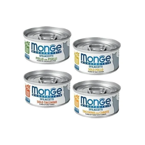 מונג' מונופרוטאין מעדן לחתול במגוון טעמים 80 גרםMonge Monoprotein Wet Cat Food 80gמונג’ מונופרוטאין מעדן לחתול במגוון טעמים הוא שימורי מזון לח לחתולים המבוסס על חלבון ממקור אחד בלבד, המכיל חתיכות בשר טעימות במיוחד באיכות סופר פרמיום שחתולים אוהבים. שימורי מונג’ מונופרוטאין לחתול יכול לשמש גם כמזון מלא ואינו מצריך שילוב של מזון יבש בנוסף אליו (לעומת מזונות רטובים אחרים המחייבים שילוב עם מזון יבש בתזונה היומיומית). ללא גלוטן וללא דגנים – Gluten and GrainFREEללא דגנים וללא חומרי טעם וריח מלאכותיים. עשיר בויטמינים ומינרלים כגון: ויטמין D3, ויטמין E, ויטמין A, אבץ וברזל. כל קופסת שימורים מכילה מעל 65% בשר טרי אשר מהווה מקור חלבון יחיד, והמזון בעל מרקם רך, קל לעיכול ועסיסי במיוחד.