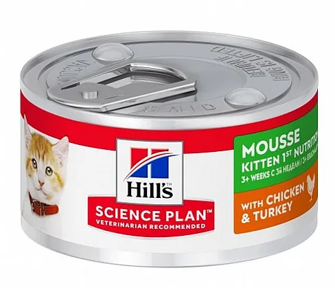 מעדן הילס סאיינס פלאן חתול גור מוס עוף והודו (85 גרם)שימורי מוס חלק לגורי חתולים, עם חומצה דוקוסהקסנואית (DHA) המופקת משמן דגים לסיוע בהתפתחות בריאה של העיניים והמוח וחלבון איכותי המסייע בגדילת השרירים. מכיל נוסחה מאוזנת של מינרלים לסיוע בטיפוח עצמות ושיניים חזקות.