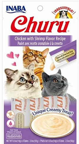 מעדן צ'ורו בטעם שרימפס56 גרםמעדן צ'ורו לחתולים – מזון משלים לחתול.