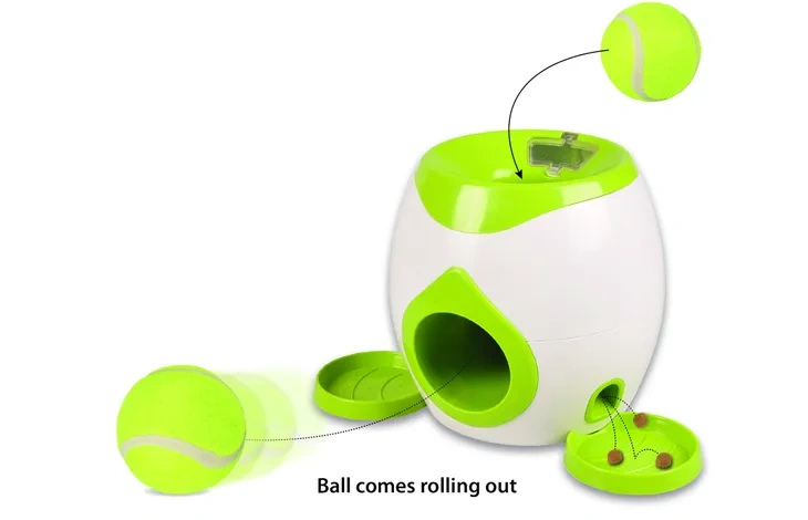 ברגע שמכניסים את הכדור למקום הכלב מתוגמל בחטיף. מגיע עם כדור טניס וכף קטנה למילוי חטיפים.