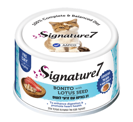 Signature7 Bonito with Lotus Seeds & Superfoods PATE דג בוניטו עם זרעי לוטוס | מזון על – מעדני פטה. מזון רטוב לחתולים 100% מלא ומאוזן. מעדן פרמיום במרקם פטה עדין בשילוב זרעי לוטוס העשירים בסיבים תזונתיים וחלבונים הנחוצים לתפקוד תקין של מערכת העיכול והלב. משקל נטו: 80 גרם
