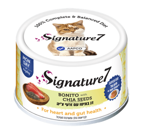Signature7 Bonito with Chia seeds & Superfoods PATE דג בוניטו עם זרעי צ'יה | מזון על – מעדני פטה | 100% מזון מלא ומאוזן | מעדן פרמיום במרקם פטה עדין, עם זרעי צ'יה כמקור העשיר ביותר באומגה 3 ובחומצות שומן חיוניות, בסיבים ובנוגדי חמצון גבוהים ובעלי ערך קלורי נמוך מאד – המסייעים לבריאות הלב והמעיים. מבשר אמיתי | בתוספת טאורין | מכיל ויטמינים ומינרלים טבעיים | עם רמת חלבון אופטימלית | לפי תקני AAFCO | ללא ויטמין K | ללא שומן וללא בשר חזיר | לכל שלבי החיים. משקל נטו: 80 גרם