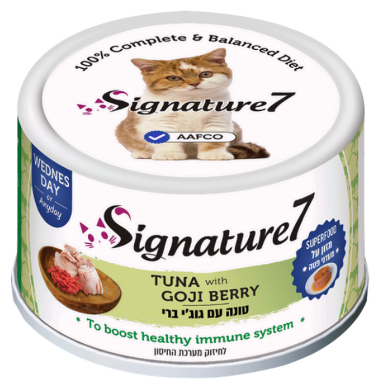 Signature7 Tuna with Goji Berry& Superfoods PATE טונה עם גוג'י ברי | מזון על – מעדני פטה | מזון רטוב לחתולים 100% מלא ומאוזן מעדן פרמיום במרקם פטה עדין בשילוב פרי יער "גוג'י ברי" העשירים בסיביים תזונתיים ובנוגדי חמצון הנחוצים לתפקוד תקין של מערכת העיכול והלב. משקל נטו: 80 גרם