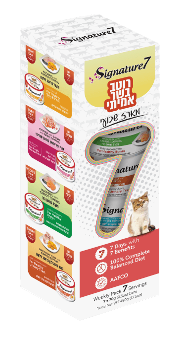 Signature7 Weekly Pack & with Real Meat Gravy סיגנצ'יר7 מארז שבועי | מזון רטוב לחתולים עם רוטב בשר אמיתי. 100% מלא ומאוזן. מארז ל7 ימים עם 7 טעמים עם 7 יתרונות. פורמולה ייחודית: המבטיחה גיוון לתפריט היומי: 100% בשר אמיתי | מכילה ויטמינים ומינרלים טבעיים | בעלת רמת חלבון אופטימלית | ללא דגנים | בתוספת טאורין | לפי תקני AAFCO. משקל נטו(ליחידה): 70 גרם. כמות במארז: 7 יח'(פחיות שימורים). משקל כולל: 490 גרם. תוצרת: תאילנד