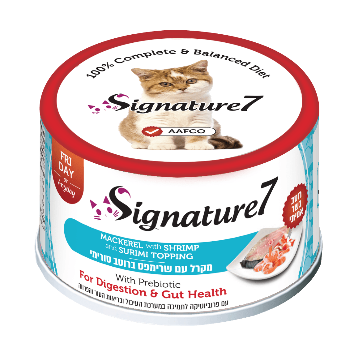 Signature7 Mackerel with Shrimp and Surimi topping & with Real Meat Gravy מקרל עם שרימפס ברוטב סורימי – שימורי פרמיום לחתול עם רוטב בשר אמיתי. מזון רטוב לחתולים, עם פרוביוטיקה לתמיכה במערכת העיכול ובריאות הפרווה. 100% מלא ומאוזן. מבשר אמיתי | ללא דגנים | לפי תקני AAFCO | עם רמת חלבון אופטימלית | מכיל ויטמינים ומינרלים טבעיים | בתוספת טאורין | לכל שלבי החיים. משקל נטו: 70 גרם