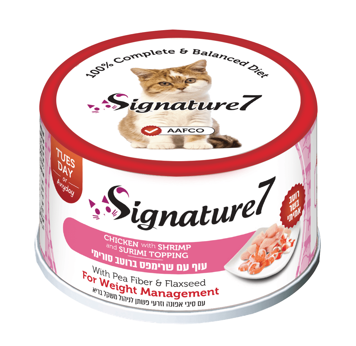 Signature7 Chicken with Shrimp and Surimi topping & with Real Meat Gravy עוף עם שרימפס ברוטב סורימי | שימורי פרמיום לחתול עם רוטב בשר אמיתי. מזון רטוב לחתולים 100% מלא ומאוזן, עם סיבי אפונה וזרעי פשתן לניהול משקל בריא. מבשר אמיתי | ללא דגנים | לפי תקני AAFCO | עם רמת חלבון אופטימלית | מכיל ויטמינים ומינרלים טבעיים | בתוספת טאורין | לכל שלבי החיים. משקל נטו: 70 גרם.