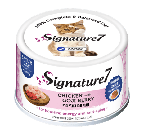 Signature7 Chicken with Goji Berry & Superfoods PATE עוף עם גוג'י ברי | מזון על – מעדני פטה. מזון רטוב לחתולים מלא ומאוזן 100%. מעדן פרמיום במרקם פטה עדין בשילוב פרי יער "גוג'י ברי" העשירים בסיביים תזונתיים ובנוגדי חמצון להגברת האנרגיה ואפקט האנטי אייג'ינג. משקל נטו: 80 גרם