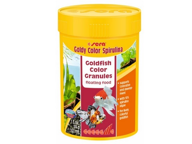 Sera Goldy Color Spirulina Nature 100ml(39g) סרה גולדי קולור ספירולינה – הינו מזון מגורען מחזק צבע לדגי זהב גדולים, לדגי נוי מהודרים נוספים ודגי מים קרים. הגרגירים הצפים שומרים על צורתם ואינם מזהמים את המים. תוצרת: גרמניה