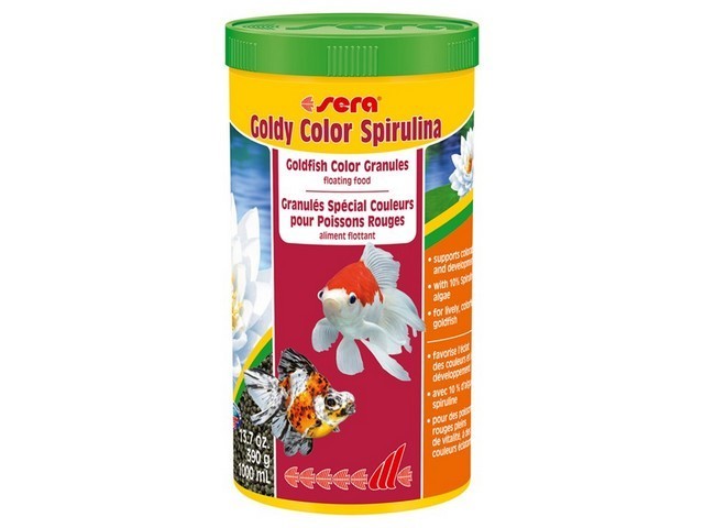 Sera Goldy Color Spirulina Nature 1000ml(390g) סרה גולדי קולור ספירולינה – הינו מזון מגורען מחזק צבע לדגי זהב גדולים, לדגי נוי מהודרים נוספים ודגי מים קרים. הגרגירים הצפים שומרים על צורתם ואינם מזהמים את המים. תוצרת: גרמניה
