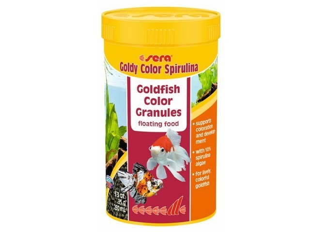 Sera Goldy Color Spirulina Nature 250ml(95g) סרה גולדי קולור ספירולינה – הינו מזון מגורען מחזק צבע לדגי זהב גדולים, לדגי נוי מהודרים נוספים ודגי מים קרים. הגרגירים הצפים שומרים על צורתם ואינם מזהמים את המים. תוצרת: גרמניה