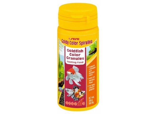 Sera Goldy Color Spirulina Nature 50ml(20g) סרה גולדי קולור ספירולינה – הינו מזון מגורען מחזק צבע לדגי זהב גדולים, לדגי נוי מהודרים נוספים ודגי מים קרים. הגרגירים הצפים שומרים על צורתם ואינם מזהמים את המים. תוצרת: גרמניה
