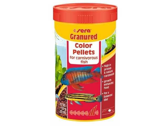 (Sera Granured 250 ml (135 g סרה גרנורד מזון בסיסי לטורפים קטנים, בעיקר ציקלידים, מורכב מגרגרים, עשיר בחלבונים וחומצות שומן אומגה, אחוז גבוה של קריל, נעכלות גבוהה ותמיכה בהתפתחות בריאה. תורם לחיזוק צבעיו הטבעיים של הדג. המזון שומר על צורתו ואינו מזהם את המים. חברת סרה השיקה סדרה חדשה הנקראת סרה טבע Sera Nature, והתאימה את סרה גרנורד לסדרה הטבעית החדשה. מזונות מבוססי הגרונולות(גרגירים) ומזונות בסיסים, עברו מודרניזציה בייצור ותפוקה. מוצרים ללא צבעי מאכל או חומרים משמרים. הצבעים הינם גרידא רכיבים טבעיים. הרכיבים מותאמים להרגלי האכילה בסביבה הטבעית של הדג. ליבת המזון חולצה בעדינות יתרה, בטמפרטורה נמוכה, לפי הדרישות הנדרשות, ושופעת בוויטמינים ומינרלים נחוצים, ובאצות המחזקות התנגדות למחלות ומאריכות את חיי הדג. תוצרת: גרמניה