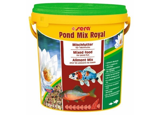 (Sera Pond Mix Royal 10L(2kg סרה(פונד) מיקס רויאל – אוכל בסיסי מעורב לדגי בריכה. המזון מכיל תערובת עלים, סטיקים, גמארוס וגרגרים. בחלקו צף ובחלקו שוקע, בחלקו מגיעה בחתיכות קטנות ובחלקו בחתיכות גדולות. בעזרת הערבוב הקיים – מאפשר להאכיל דגים בכל מני גדלים ומיניים. תוצרת: גרמניה