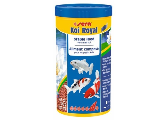 (Sera Koi Royal Mini 1,000 ml (300g/10.5 oz סרה קוי רויאל הוא מזון בסיסי עשוי מגרגרים צפים ששומרים על צורתם ולא מזהמים את המים. מתאים לדגי קוי ולכל סוגי דגי הבריכה, ובפרט לקרפיון יפני. בקרוב! (Sera Koi Royal Nature Mini(1000 ml/300g – ללא צבעי מאכל וחומרים משמרים, עם 4% ארוחה של חרקים המופקים בר-קיימא, עם חומצות שומן אומגה, ויחס הפחמימה המאוזן לעומת החלבון. מזון התומך בהתפתחות הבריאה ובעמידות למחלות של הדג. תוצרת: גרמניה