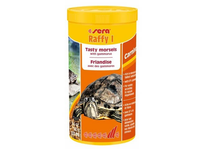 (Sera Raffy I 1.000 ml (130g מזון משלים לצבי מים ואיגואנות, מאוזן ומותאם לתזונה של הזוחלים בטבע. עתיר בחלבון, חומצות שומן אומגה, קרוטנואידים יקרי ערך, מינרלים ויסודות קורט וכן בסיבים המווסתים את העיכול. פינוק המכיל 87% שרצים (Gammarus ) מיובשים בעדינות, דגי ים וקרילים, המפתח התנגדות למחלות, ומאריך את חייה של חיית המחמד. תוצרת: גרמניה
