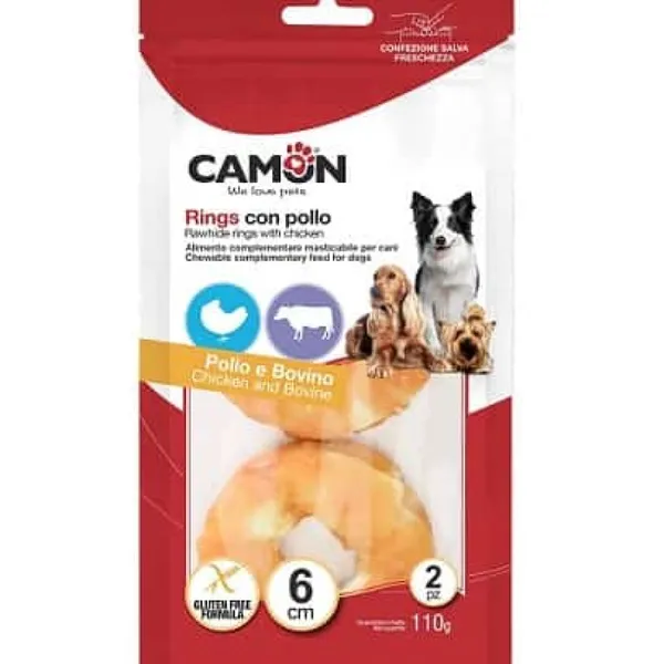 צעם בצורת טבעת עם עוף 2 י"חטבעות עור גולמי טעימות עם עוף, חטיף תגמול מושלם לכלבים בוגרים. פורמולה ללא גלוטן. קל להציע לכלב הודות לאריזה הניתנת לסגירה חוזרת שחוסכת טריות.