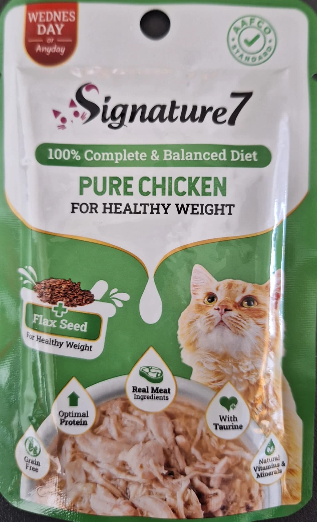 פאוץ' מבית SIGNATURE 7, מזון מלא ומאוזן 100% לחתול בטעם עוף ופשתן מעולה לשמירה על משקל החתול.