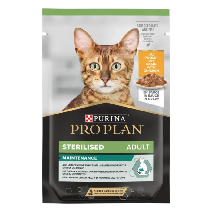 מזון לח פרו פלאן -נתחי בשר עוף ברוטב עשיר לחתולים לאחר סירוס או עיקורתומך בבריאות מערכת השתן ומפחית את הסיכון להתפתחות זיהום ודלקת בדרכי השתן התחתונות.מסייע בצריכת נוזלים ובכך מקטין את ריכוז המינרלים המומסים בשתן.מכיל רמה גבוה של ויטמין E ונוגדני חמצון לתמיכה בבריאות מערכת השתן.
