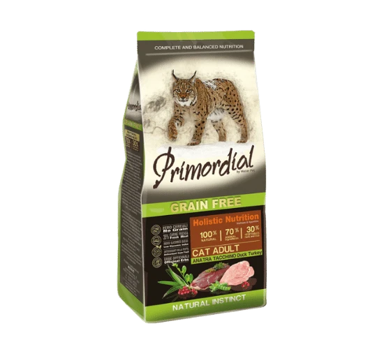 פרימורדיאל ללא דגנים לחתולים בוגרים – הודו ברווז חמוציות לספדזה 2 ק"ג Primordial Grain Free For Adult Cats – Turkey Duck Cranberry Lespedeza