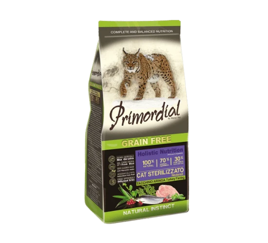 פרימורדיאל ללא דגנים לחתולים בוגרים מסורסים – הודו הרינג חמוציות לספדזה 2 ק"ג Primordial Grain Free For Neutered Adult Cats – Turkey Herring Cranberry Lespedeza